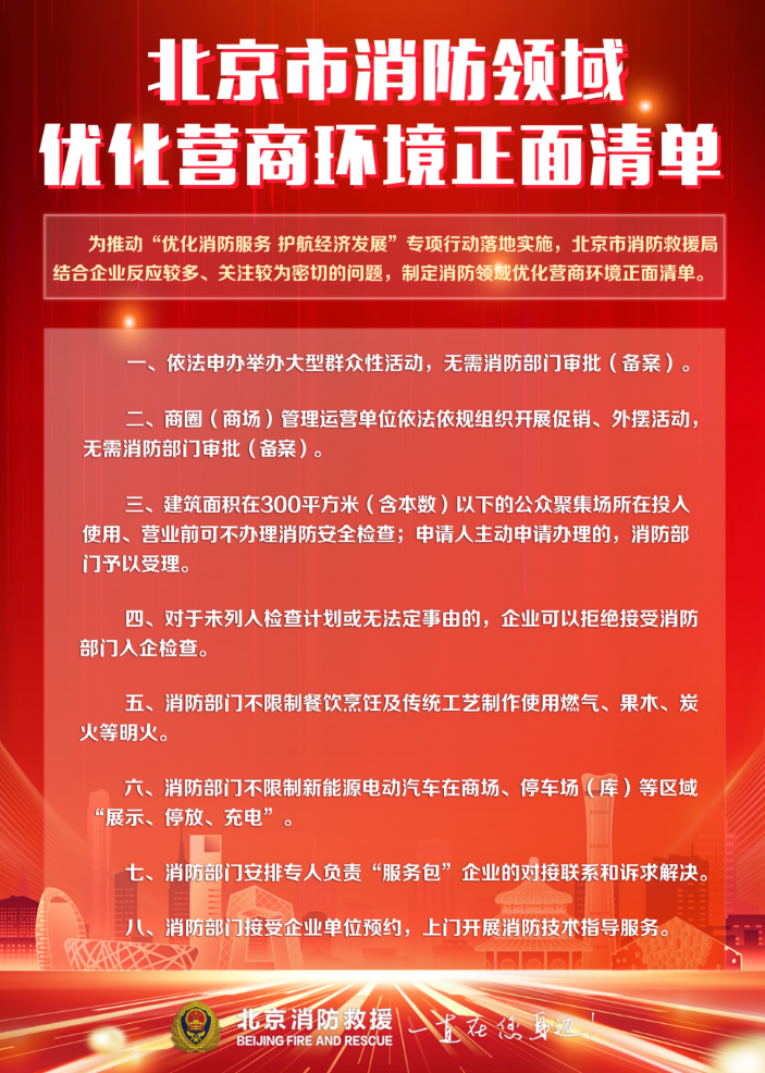 為推動“優(yōu)化消防服務(wù) 護(hù)航經(jīng)濟(jì)發(fā)展”專項(xiàng)行動落地實(shí)施,北京市消防救援局結(jié)合企業(yè)反映較多、關(guān)注較為密切的問題,制定了消防領(lǐng)域優(yōu)化營商環(huán)境正負(fù)面清單,下面我就清單內(nèi)容進(jìn)行通報(bào)。