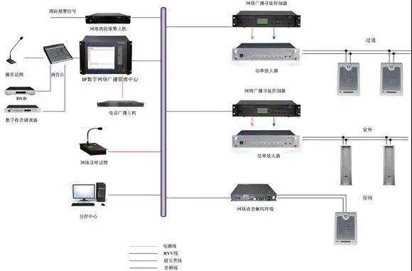 消防廣播系統(tǒng)用于在發(fā)生火災(zāi)時(shí)指揮現(xiàn)場(chǎng)人員安全疏散,采用多路總線結(jié)構(gòu),信號(hào)傳輸使用銅芯絕緣導(dǎo)線(該系統(tǒng)可與音樂(lè)/廣播系統(tǒng)合用)。
